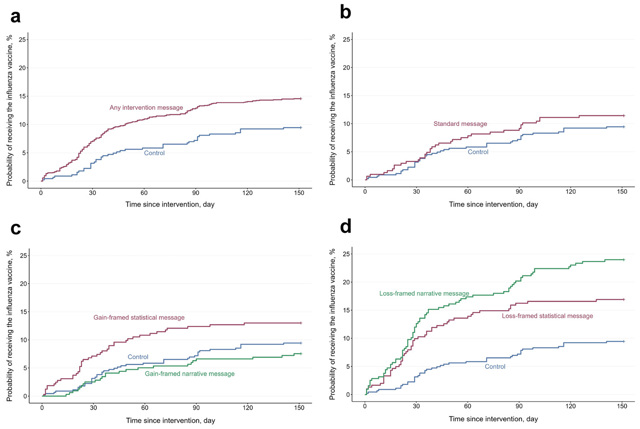 进一步分析(图2)显示,损失叙事信息组儿童流感疫苗接种概率显著增加(相对危险度 [RR] 2.50,95% CI: 1.27–4.94),且该效果在干预后五个月内持续显著。损失统计信息组在干预第一个月接种率显著提升(相对危险度 [RR] 2.73,95% CI: 1.50–4.99),但随着时间推移,其效应迅速减弱。相反,标准信息组及收益信息组,均未观察到显著效果。这些结果表明,持续且情境化的数字助推干预,尤其是通过强调不接种的潜在风险并结合生动叙事的方式,能够显著提高儿童疫苗接种率。
