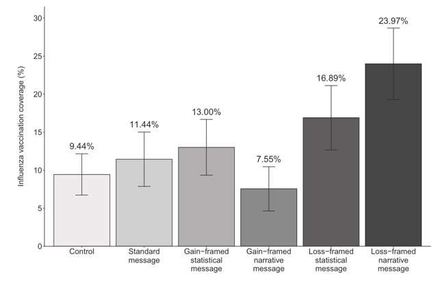 研究结果(图1)显示,数字助推显著提高了儿童流感疫苗接种率。与对照组相比,接受损失叙事信息家长的儿童接种率最高,为达到24%,损失统计信息组接种率为 17%,均显著高于对照组 9%。而标准信息组(11%)、收益统计信息组(13%)及收益叙事信息组(8%)与对照组相比,未显示显著差异。