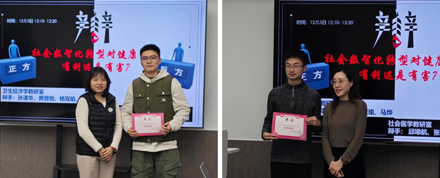 为深入学习贯彻党的二十大精神,特别是二十届四中全会关于“加快发展新一代人工智能”“完善国家治理体系”的部署要求,深刻把握数字技术赋能国家治理与公共服务的内在逻辑,深入探讨前沿科技与社会发展的辩证关系,提升师生对重大公共卫生议题的思辨能力与时代使命感,2025年12月3日,复旦大学公共卫生学院社会医学教研室党支部与卫生经济学教研室党支部在图文信息楼1440室,联合举办了一场专题辩论赛。卫生经济学教研室党支部副支书蒋虹丽老师、社会医学教研室党支部纪检委员王静夷老师以及双方党支部学生参与本次活动。