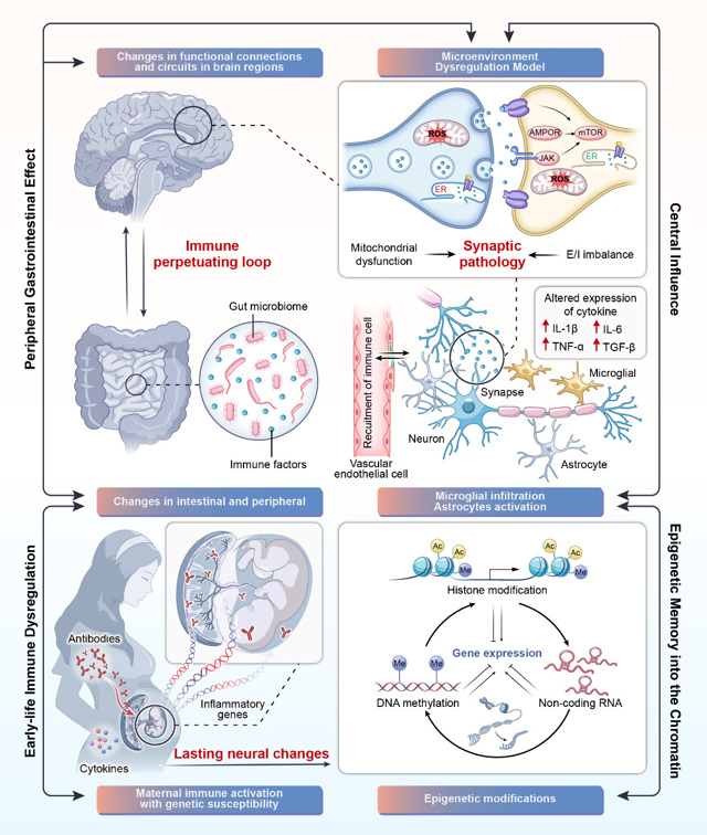 ASD是一类常见且高度异质的儿童神经发育障碍疾病。近年来,围绕其遗传基础、环境影响及相关生物学机制的研究不断深入,但这些证据长期分散在不同研究方向中,整体上仍缺少一个相对统一的解释框架。张蕴晖教授团队认为,ASD并非由某一个单独因素所致,而更可能是在遗传易感背景下,多种生物学过程在发育关键阶段共同作用的结果。基于这一认识,文章提出“微环境失调模型”,认为遗传易感性与环境暴露可能在少数关键通路上发生交汇,并共同作用于中枢神经系统和外周胃肠道这两个重要生物学微环境。在这一模型下,生命早期免疫失衡在部分个体中可与遗传风险相互作用,进一步影响表观遗传程序、神经免疫信号、突触发育及肠脑轴稳态,最终参与ASD神经发育轨迹和行为表型的形成。这一模型并不是试图用单一路径解释所有ASD,而是希望在复杂差异中寻找具有共同基础的机制线索,为理解其复杂异质性提供一个更连贯的分析视角。
