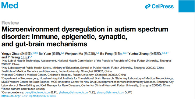 复旦大学公共卫生学院张蕴晖教授、赵迎亚青年副研究员团队与复旦大学附属儿科医院合作,近期在《Med》(Cell Press旗下期刊,2026年4月刊封面特辑)发表长篇综述“Microenvironment dysregulation in autism spectrum disorder: Immune, epigenetic, synaptic, and gut-brain mechanisms”。该综述针对孤独症谱系障碍高度异质的临床与生物学特征,系统总结了免疫、表观遗传、突触功能及肠—脑轴等关键领域的研究进展,并在此基础上提出“微环境失调模型”。这一模型为揭示ASD的核心病理机制、识别可干预的生物学亚型,以及推动从机制到精准干预的转化研究提供了新思路。