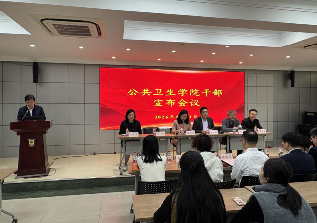 2026年4月21日上午,公共卫生学院在枫林校区8号楼825报告厅召开副院长任职宣布大会。上海医学院党委组织部部长杜楚源、校党委党校办公室主任、组织部副部长童一明、上海医学院党委组织部副部长闫兆伟出席会议,学院党政班子成员、教研室主任代表、教工党支部书记及中层干部代表参会,会议由学院党委书记罗力主持。