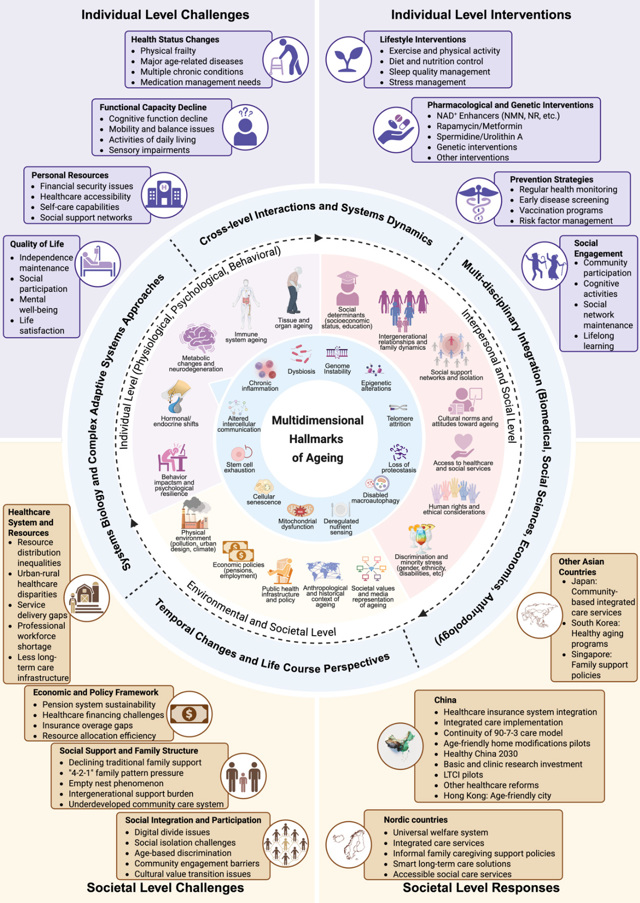 基于分子层面、个体层面及群体/社会层面应对老龄化与疾病的策略