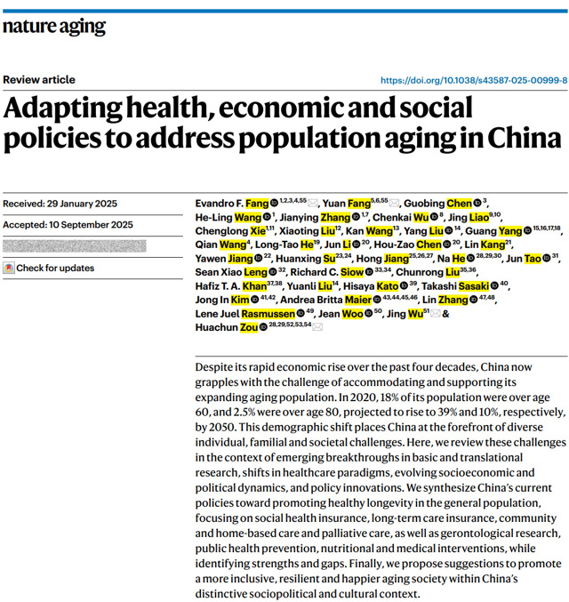 基于上述背景,我院邹华春教授联合挪威奥斯陆大学方飞教授(挪威科学与文学院院士)、方圆博士后、瑞典哥德堡大学吴晶教授等30余位来自不同国家和地区的专家共同撰写了题为“Adapting health, economic and social policies to address population aging in China”的综述文章,近日发表在Nature Aging。本文综述了我国在人口老龄化领域的相关进展、挑战及潜在应对方案,总结了中国当前在促进普通人群健康长寿方面的各项政策,重点关注社会医疗保险、长期护理保险(LTCI)、社区与居家养老、姑息治疗、老年医学研究、公共卫生预防以及营养与医疗干预等领域,并分析了其中的优势与不足。提出在符合我国独特社会政治与文化背景的前提下,通过实施针对性策略,并整合借鉴日本、韩国、新加坡、北欧各国及中国香港特别行政区等国家和地区的经验与洞见,制定出更科学、高效且富有人文关怀的策略,推动建设一个更具包容性、韧性且能让老年人生活更幸福的老龄化社会。此外,本文还提出了一个多层次框架,用于在分子层面、个体层面以及群体/社会层面应对老龄化挑战、提升生活质量。这一框架或可为所有正在面临人口老龄化问题的国家提供参考。