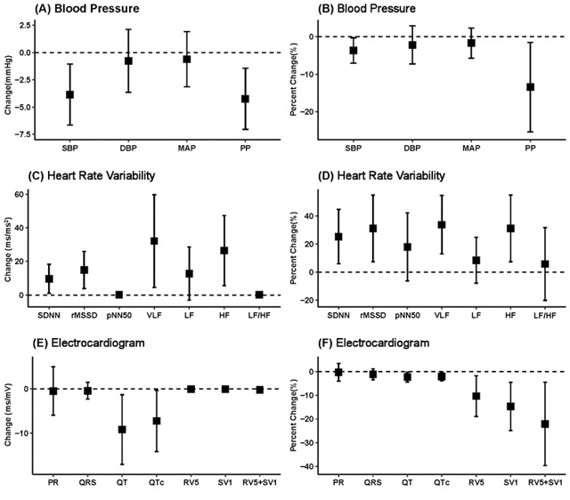 图2 空气净化干预引起的儿童血压、心率变异性和心电图的绝对变化和相对改变