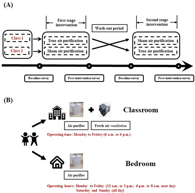 为填补这一研究空白,研究团队在我国北方某城市某小学开展了一项持续两个学期的随机、双盲、交叉对照试验(其中,暑假为洗脱期)。研究在教室内同时安装新风系统和两台空气净化器(放或不放HEPA滤芯作为干预或对照),并相应在儿童家里卧室放置一台空气净化器(放或不放HEPA滤芯),从而实现了对儿童全天主要室内活动场所的空气质量干预(图1)。研究共招募四年级两个班共105名健康儿童参与试验,实时监测教室、家庭和室外的PM2.5水平,并利用时间-微环境活动模式通过时间加权方法计算儿童在干预期间的个体PM2.5暴露平均水平。研究在每阶段干预前后分别测量儿童的血压、心率变异性和心电图指标,同时采集血清进行非靶向蛋白质组学分析。