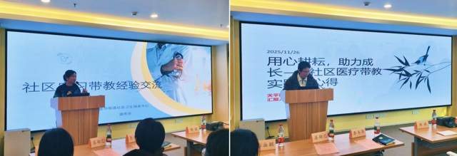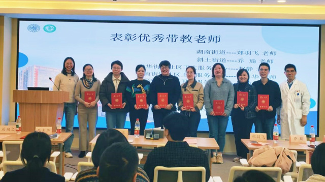 在随后进行的优秀带教老师经验交流环节中,来自湖南街道的郑羽飞老师、斜土街道的乔瑜老师,以及六家街道社区卫生服务中心赵静、李冬华、居励之、余铭刚、彭淑颖、谢雯、谢雨苏共九位老师依次发言。他们围绕“以学生为中心”的教学理念,分享了在带教过程中注重人文关怀、强化沟通能力、实施个性化教学、采用启发式方法等方面的实践与思考,展现了带教工作的专业性与艺术性,为与会教师提供了宝贵的借鉴与启发。