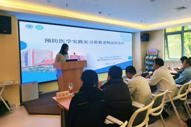 为总结实习带教工作经验,提升社区街道带教教师的专业素养与教学能力,2025年11月26日下午,复旦大学临床医学专业2025年度预防医学实践实习带教老师总结会议在湖南街道社区卫生服务中心会议室顺利召开。复旦大学公共卫生学院预防医学教研室教师代表,及来自多家教学实习基地的带教老师共60余余人参加了本次会议。