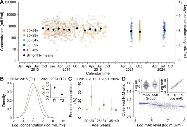 (A-B:抗体浓度随时间的变化; C:易感人群构成;D:年龄别易感性)