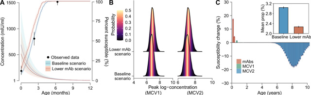 (A:抗体浓度与易感性水平;B:MCV诱导抗体浓度峰值;C:年龄别易感性变化)