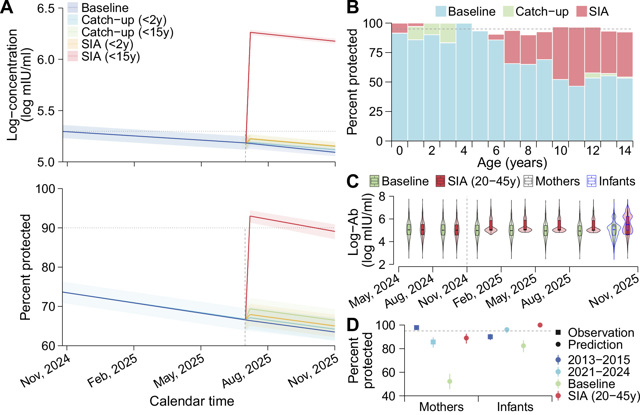 研究进一步验证了个体预存免疫对疫苗免疫应答的线性影响,并以此开展模拟研究,评估了对不同年龄组人群实施查漏补种与强化免疫以改善人群免疫缺陷的可行性。结果发现,若无任何免疫干预措施,儿童的疫苗诱导免疫将呈持续衰减趋势。截止2025年7月,仅66%的儿童仍具有保护性免疫水平,远低于2013-2018年同年龄段儿童的水平(92.2%)。查漏补种可有效改善既往接种率偏低(<92%)的年龄组人群的免疫力(包括受新冠大流行影响MCV接种的儿童),提升幅度为4.3-16.7%。然而,若使15岁以下儿童和育龄妇女的免疫水平重新达到控制麻疹病毒传播所需的群体免疫阈值(90-95%),只能通过对这两类人群实施强化免疫来实现。