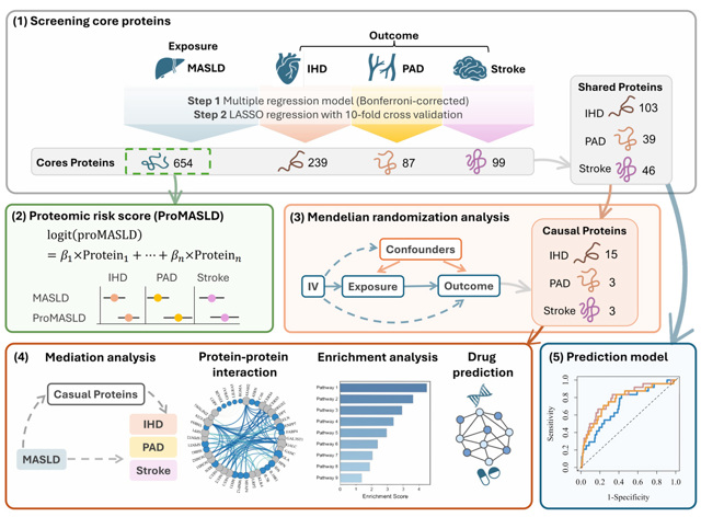 近日,复旦大学公共卫生学院余勇夫、秦国友团队在心血管领域专业期刊Cardiovascular Diabetology上发表了题为“Proteomic Signature of Metabolic Dysfunction-Associated Steatotic Liver Disease and Risk of Atherosclerotic Cardiovascular Disease”的研究论文。该研究系统探索了代谢异常相关脂肪性肝病(metabolic dysfunction-associated steatotic liver disease,MASLD)与动脉粥样硬化性心血管疾病(atherosclerotic cardiovascular disease,ASCVD)之间的蛋白质组学联系,并构建了一个面向 MASLD 人群的 ASCVD 风险预测新模型,为高危个体识别提供了新的工具与证据。