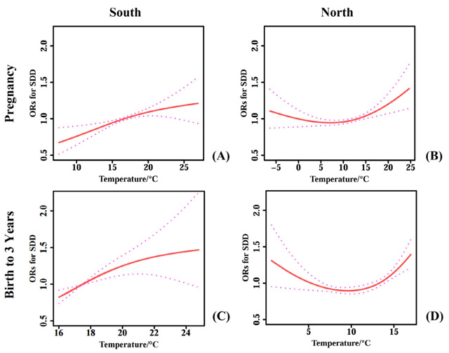 图2、南北地区分层的生命早期孕期(A:南方;B:北方)以及出生后0-3岁(C:南方;D:北方)平均气温暴露与学龄前儿童总体SDD风险间暴露-反应曲线