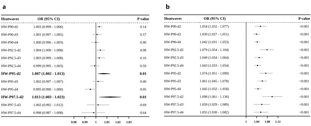 图3、生命早期孕期(a)以及出生后0-3岁(b)经历热浪天数与学龄前儿童总体SDD风险间关联