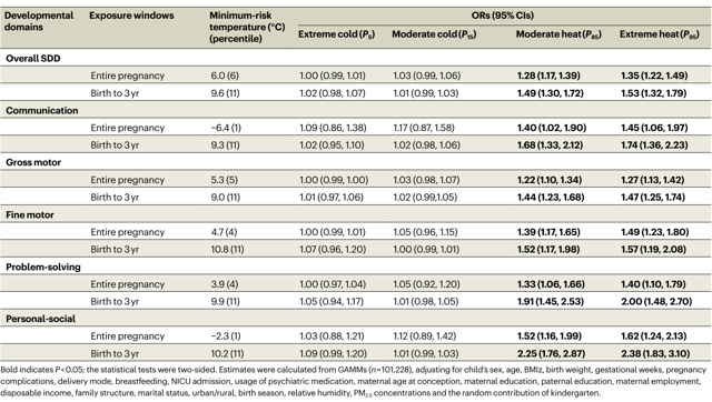 表1、生命早期孕期以及出生后0-3岁环境冷和热暴露与学龄前儿童总体及各维度SDD风险间关联
